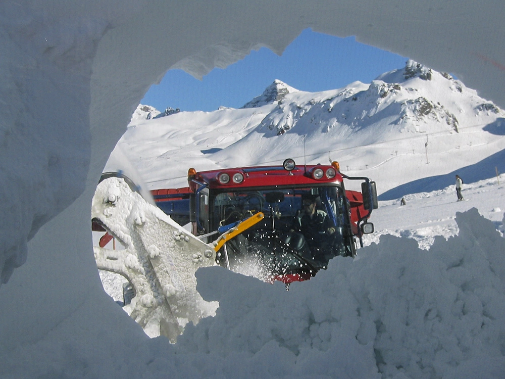 It is running with a quite high working speed on both sides - left and right - in one direction. This is possible because of the patented overhead turning mechanism of 180°. The very light and really easy to handle front-adding equipment with it’s patented grooming system can be mounted on small, medium and big snow grooming vehicles.